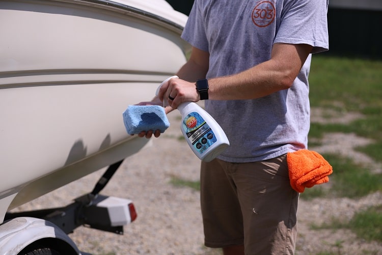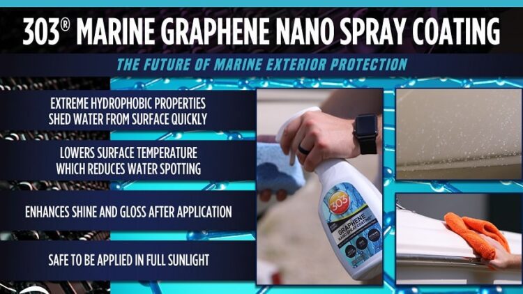 If you are concerned about water spots showing up in boats gel coat or glass, worry no more! With the combined properties of hydrophobic protection and surface temperature reduction, hard water spots will be a thing of the past. The dynamic graphene oxide formula contained in 303® Marine Graphene Nano Spray Coating reduces the surface temperature of paint. Doing so ensures that water cannot dry and embed itself into the surface, causing hard water spots. Any water spots that show up will be on top of the coating. Any instances of lingering water droplets are easily wiped away with a microfiber towel or detailer.