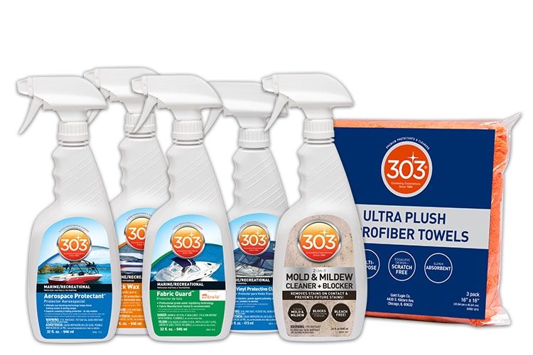 303® Quick Wax is the fastest solution for making your boat shine. This formula is a gentle cleaner that helps remove water spots, dust, and other debris from the hard surfaces on your boat, and it leaves a protective layer that helps repel these elements during your next trip out on the water. It also contains superior UV protection that lasts up to 30 days, preventing color fading. 303® Quick wax contains Carnauba wax.