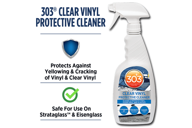 303 Clear Vinyl Protective Cleaner offers superior protection against the harmful effects of UV rays. This product is all you need to safely clean and protect against yellowing and cracking of vinyl, clear vinyl, Strataglass and Eisenglass boat windows, leaving a non-streaking finish.
