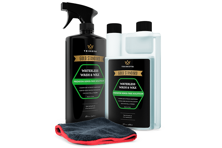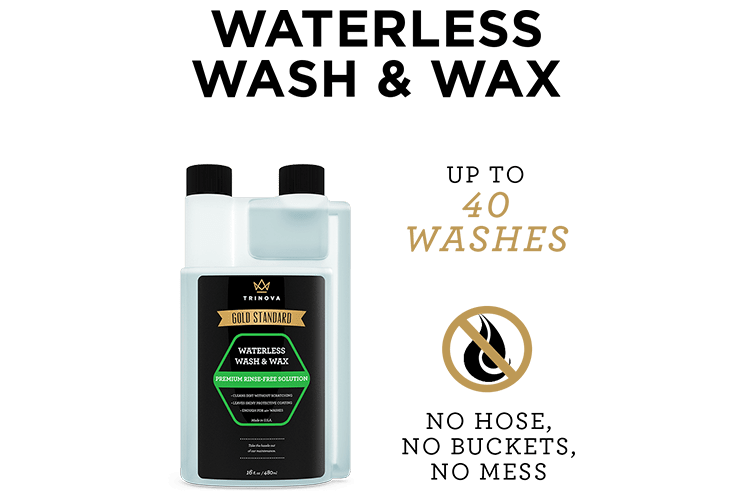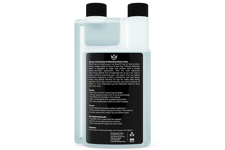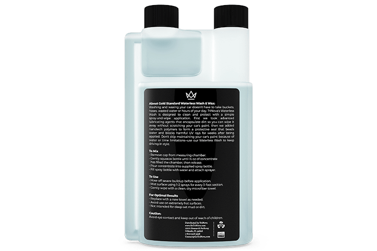 Just a 1/2 ounce of TriNova Waterless Car Wash & Wax concentrate makes a full bottle, more than enough to clean a standard sized car. Our product was specifically designed to encapsulate dirt, grime, and residue to wipe off without scratching paint while providing a protective coat that repels water and blocks harmful UV rays.