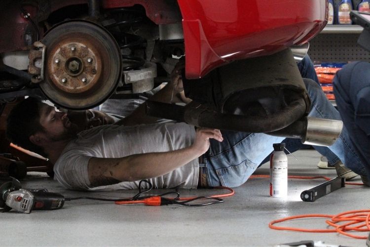 Once the intake was out, we needed to head under the car to remove the old exhaust to make room for our new one. “There’s going to be a lot of rust and debris falling from the car when you’re under there,” Galuska said. He advises using safety glasses whenever heading under the car. “We knew we were going to be using a grinder and a Sawzall, so it was just a safety precaution.”