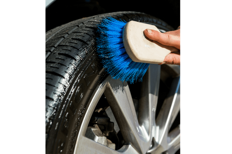 Then take a Tire Brush and start scrubbing the surface with it to quickly remove any stubborn grime that didn’t come off from the cleaning solution alone. After rinsing, scrub again ith the brush and rinse. Repeat the process until the foam on the tire is white. The next step is to rinse your tires with water and then dry them. And that’s all it takes to get your tires looking practically spotless!
